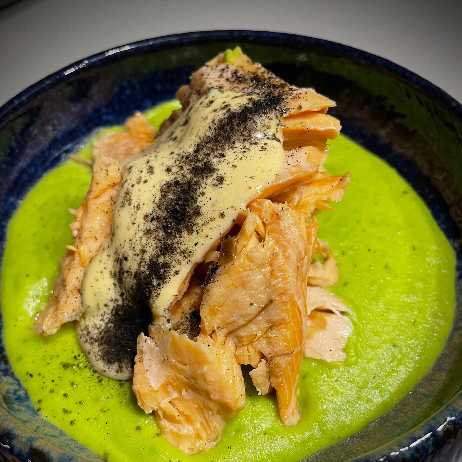 2. Gang: Wolfsbarsch Salzkruste | Erbsen-Minz Pürree | Zwiebelasche | Nussbutter Mayonnaise
